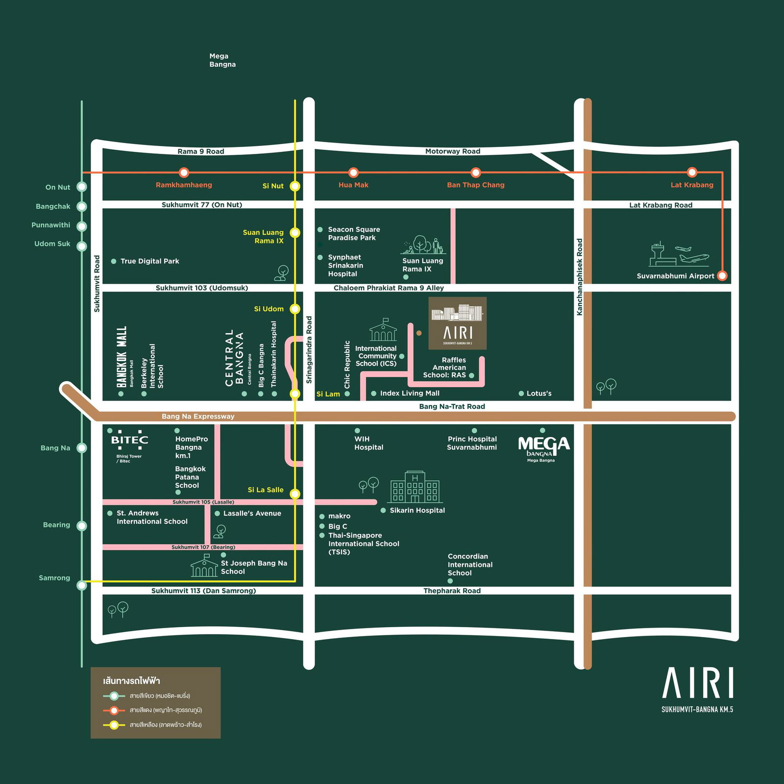 The area Bang Na is also home to several large-scale developments, including The Bangkok Mall (which is set to become Thailand’s largest shopping complex), The Forestias by MQDC, and the upcoming Silver Line–a light rail system that will connect Bang Na to Suvarnabhumi Airport. These projects complement the area’s many existing shopping malls and facilities, most of which are within a 12-minute drive from the AIRI Sukhumvit–Bang Na KM.5: