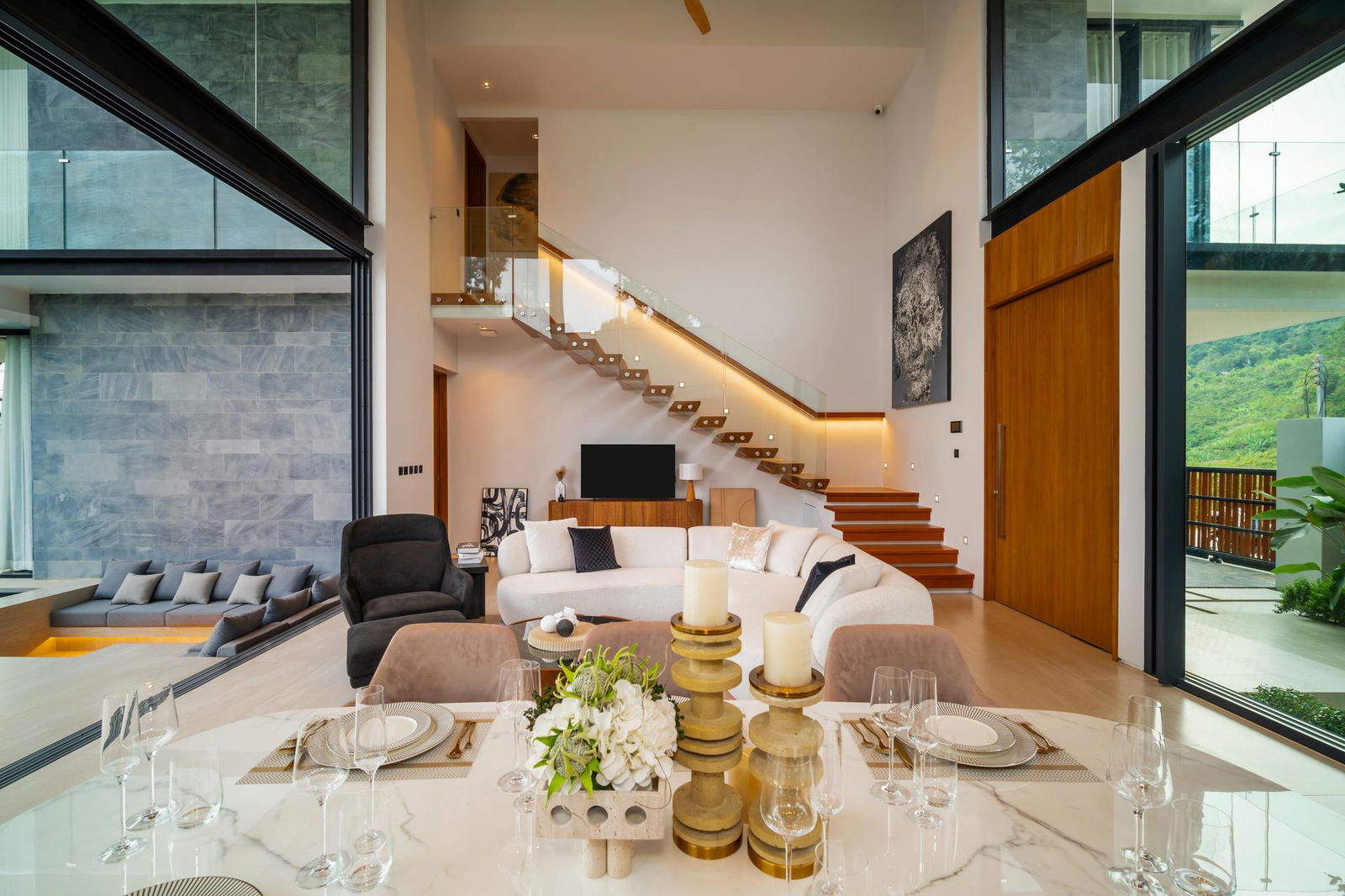 All villas feature grand living rooms with extra high floating ceilings, Full-height single-pan sliding glass doors allow to open up the living room space, seamlessly connecting it with the deck and garden. Every villa comes with a private swimming pool and garden (developer will replant grown trees in each villa, so that you don’t have to wait for your garden to grow).