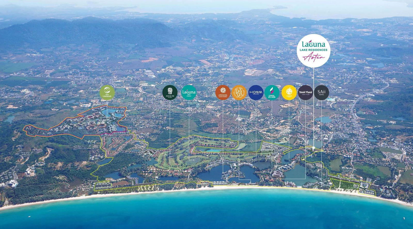 Laguna Aster is set near the entrance to Laguna Phuket in the Thalang district of the island. The surrounding area features a diverse mix of resort amenities, shopping and dining venues, wellness clinics, and educational institutions.