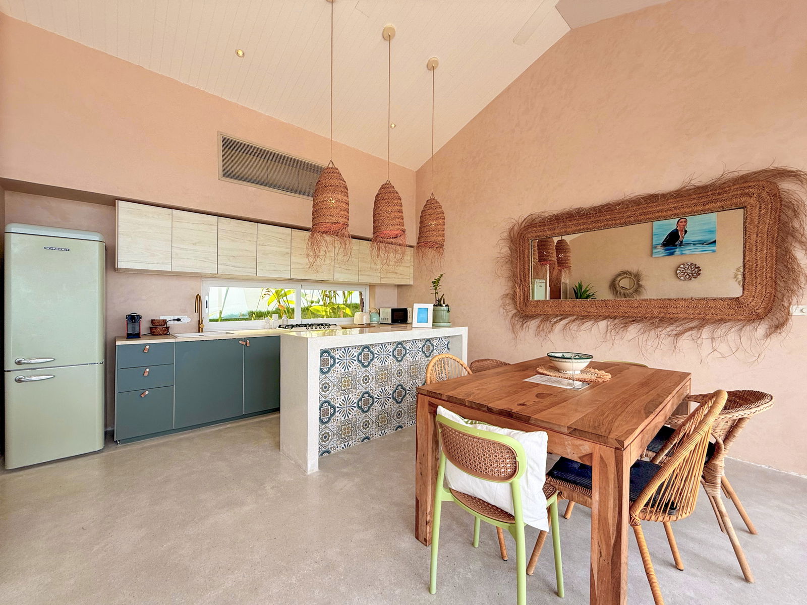 The villa has high ceilings and comes fully furnished with quality fittings throughout, including SMEG kitchen appliances. At the heart of the home, an open-plan living and dining area connects seamlessly to the kitchen, designed for a relaxed tropical style of living.
