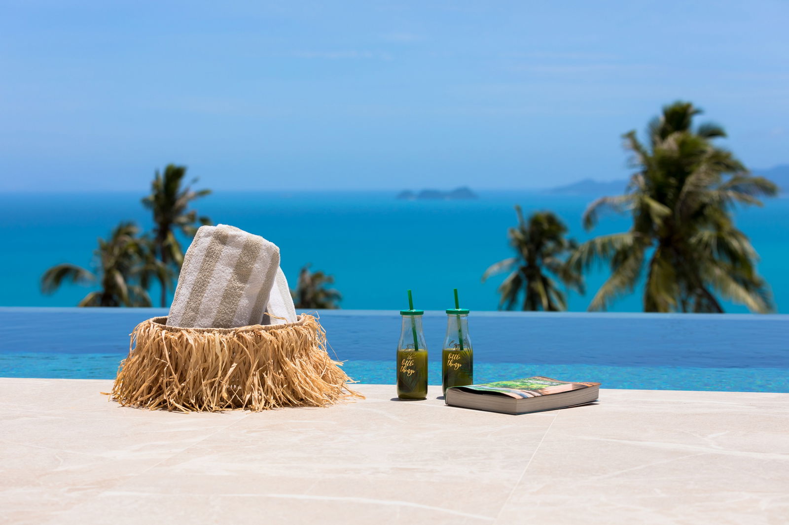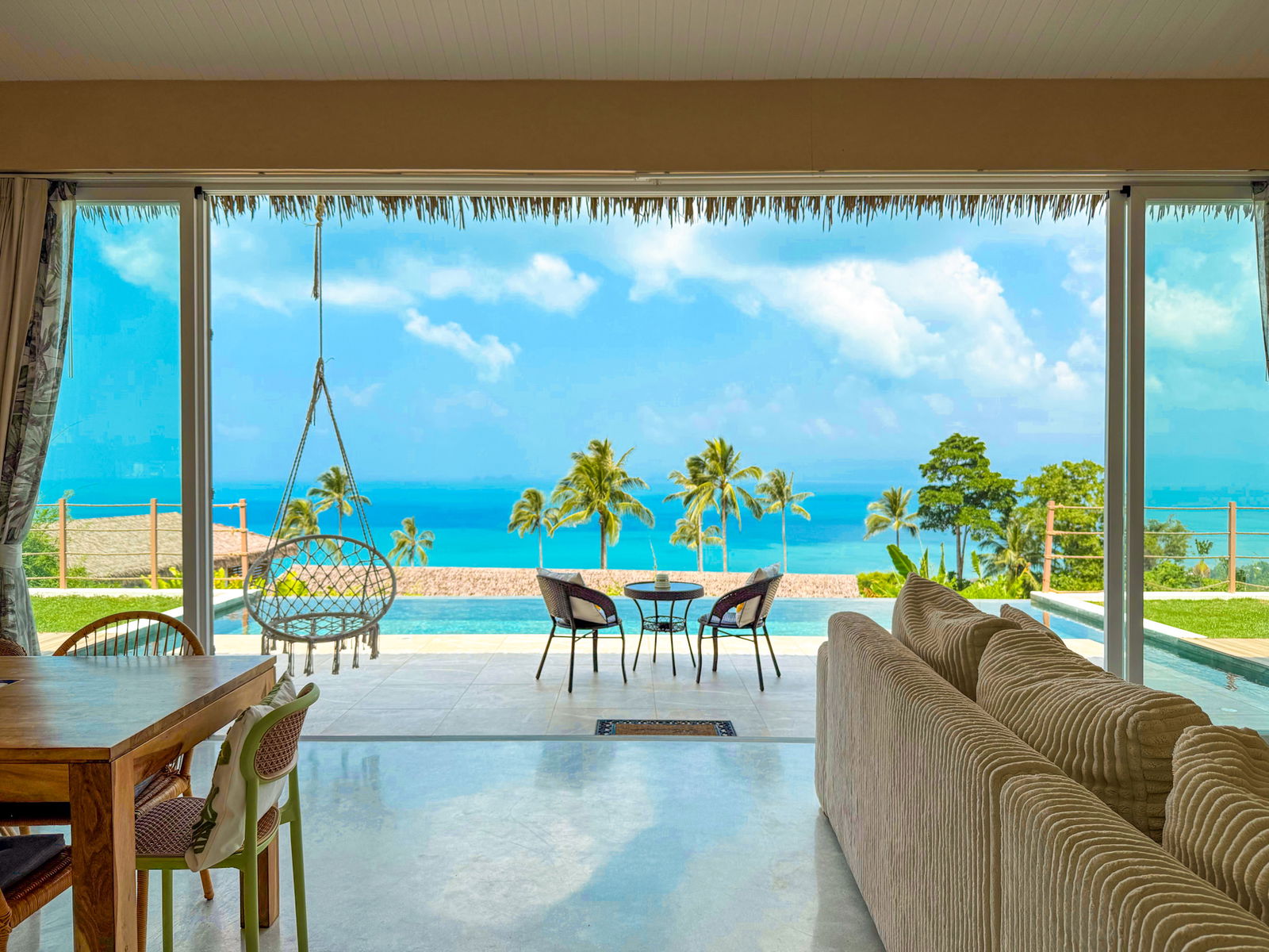 Overhead, a durable synthetic thatched roof offers protection from heat and rain while adding island character to the villa. The infinity pool has stunning panoramic sea views toward Koh Phangan.
