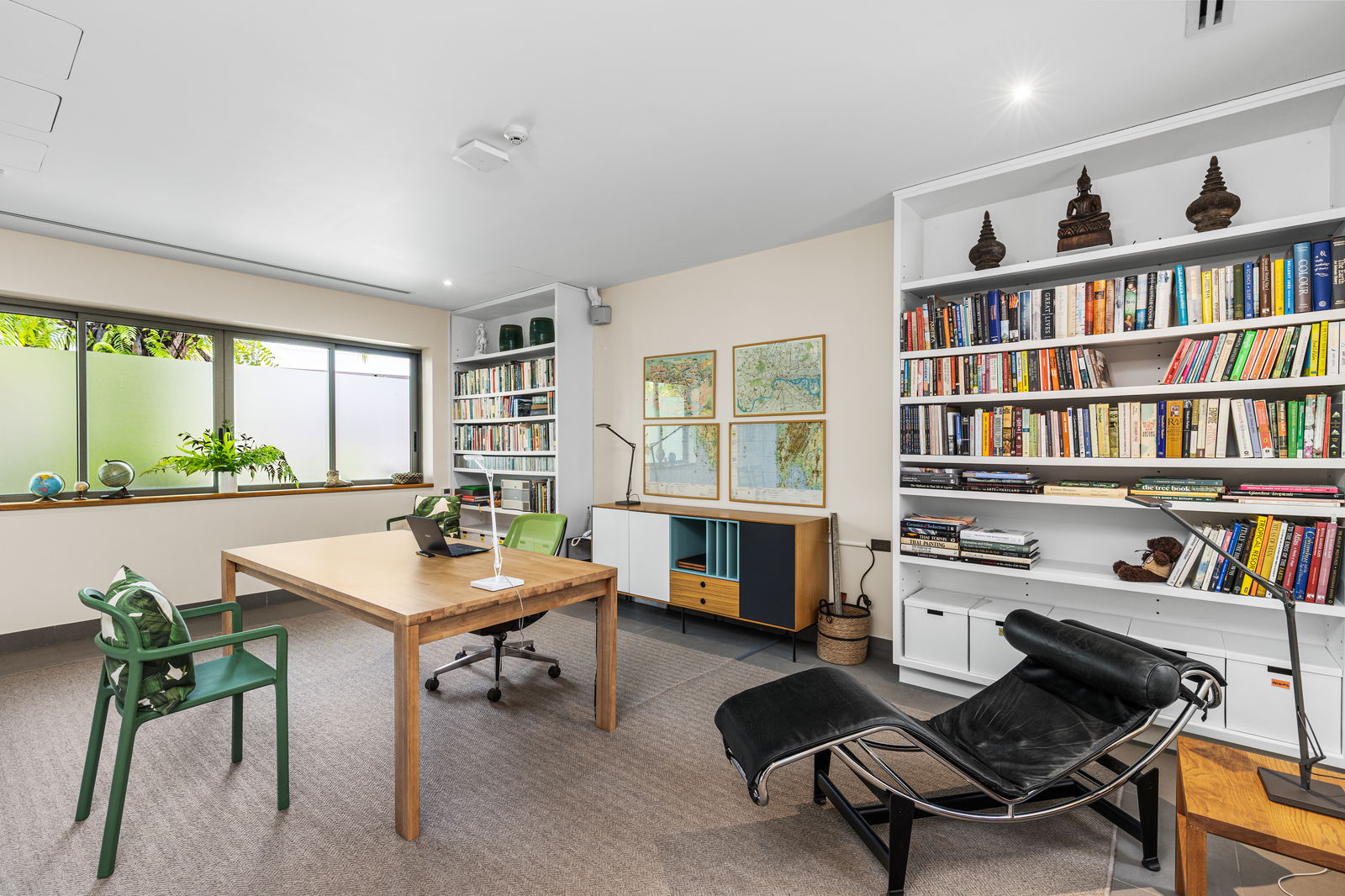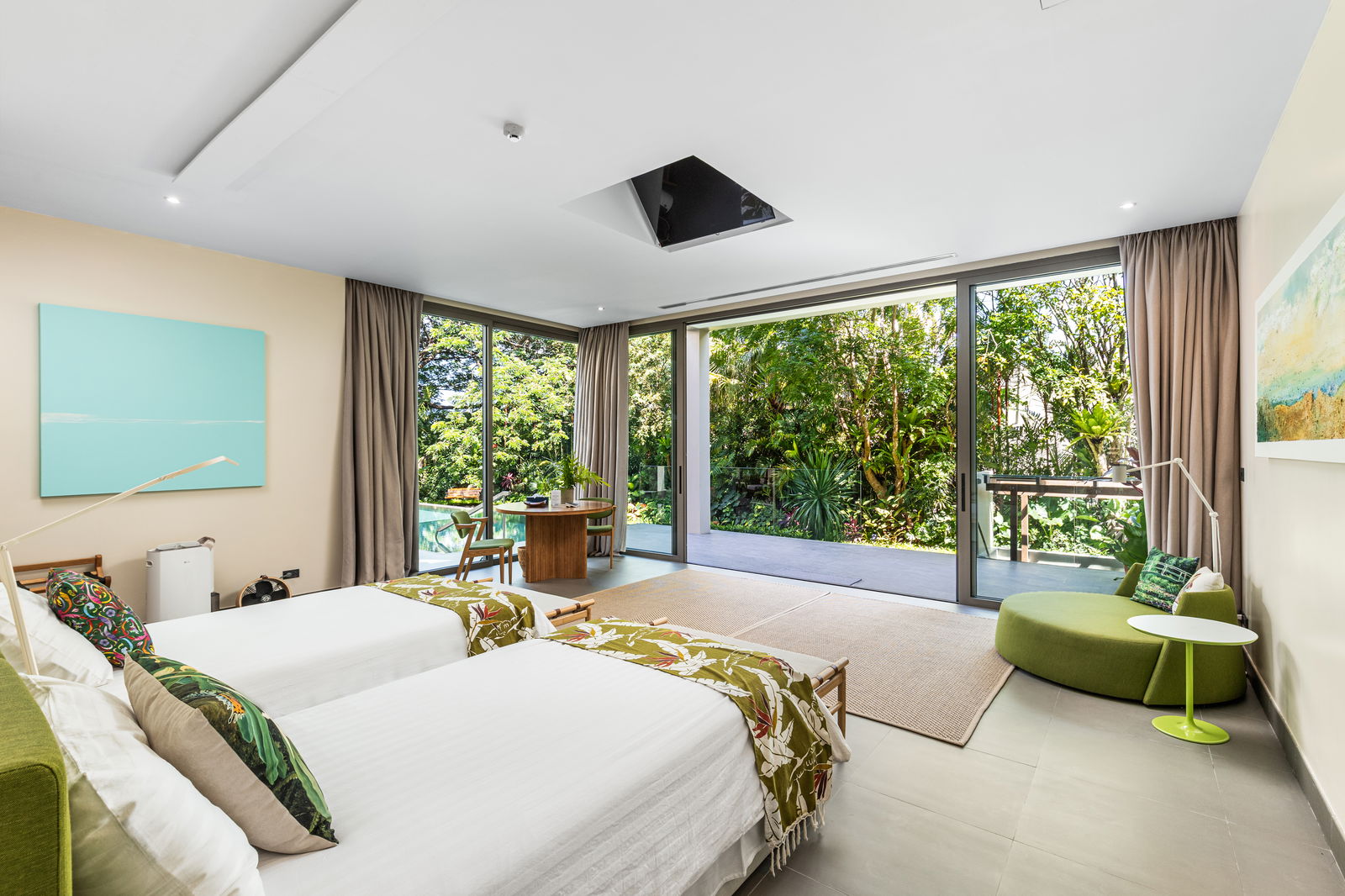 The upper level includes the master suite and versatile studio-bedroom, both of which open onto private verandas with tranquil garden and mountain views. The master bedroom features a deep soaking tub, rain shower, and dual vanities, while the studio-bedroom provides generous workspace, floor outlets, and a large walk-in wardrobe. There is also a third room on this level that serves as a library and media lounge, but it can be adapted for personal needs.