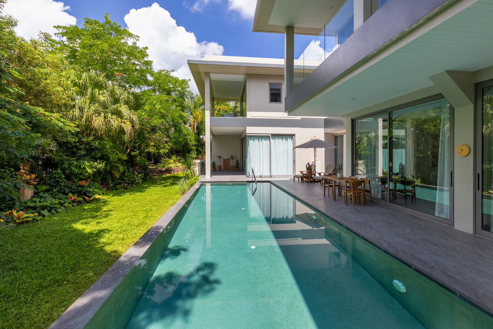 The ground floor’s spacious open-plan living areas flow seamlessly from the designer kitchen and central island to the dining area and 42 sq. m entertainment lounge, while large sliding glass doors open onto the pool terrace for effortless indoor-outdoor living. There are also two guest bedrooms, one more intimate and the other more spacious, with private bathrooms and direct access to the garden. A separate Thai kitchen, pantry, and maid’s living area provide added practicality and convenience for full-time living or hosting.