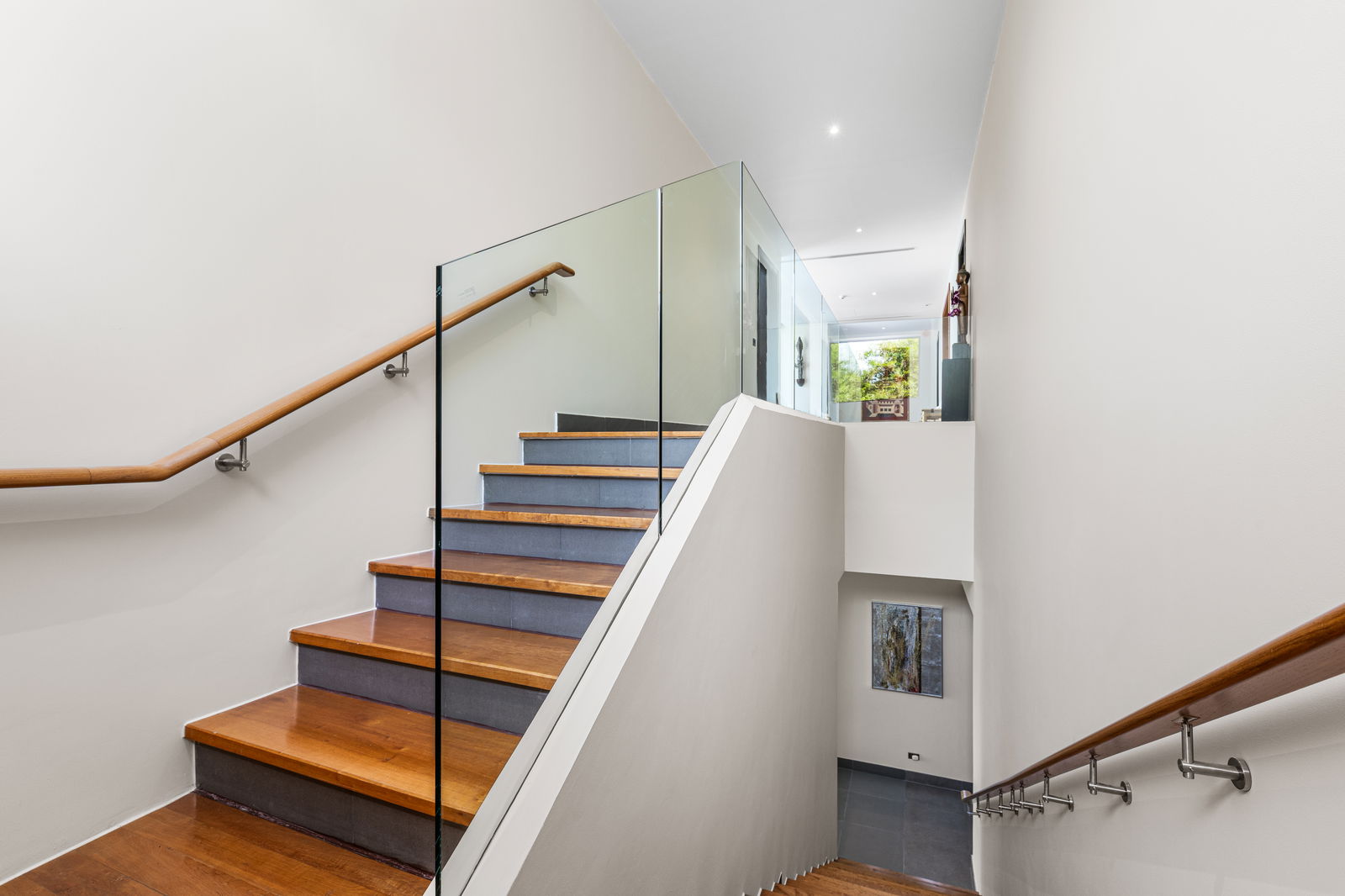 The entrance of Villa Mimosa leads through a welcoming foyer to the main staircase for the upper level. The upper level can also be reached by the newly installed Schindler lift, which connects from the garage level and provides full wheelchair accessibility.