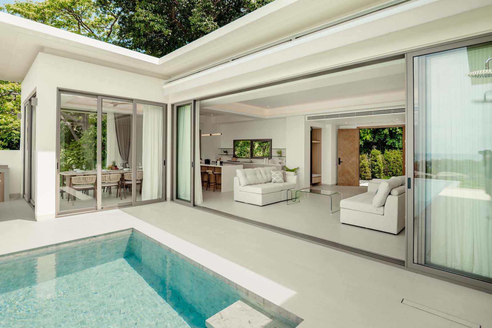 All villas feature open-plan living and dining areas and are delivered complete with fully equipped high-end kitchens, built-in furniture, zoned air conditioning, walk-in wardrobes, en-suite bathrooms in each bedroom, and panoramic windows with ocean views.